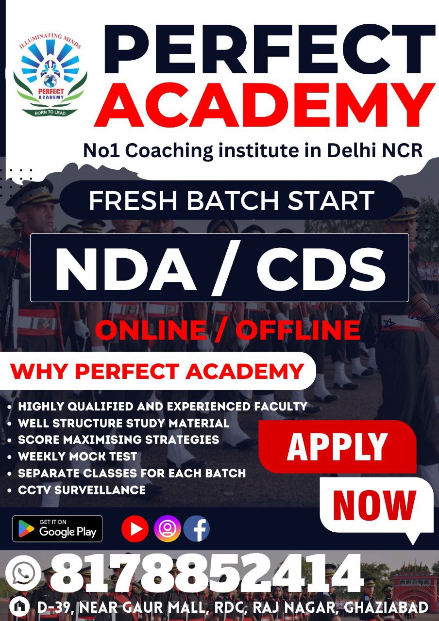 NDA Coaching in Ghaziabad. Perfect Academy in Ghaziabad is a trusted name for NDA coaching, offering a well-structured program to help students excel in the National Defence Academy entrance exam. The institute provides expert guidance, comprehensive study material, and rigorous test series to strengthen conceptual understanding. With a focus on both written exams and SSB interviews, Perfect Academy trains candidates in logical reasoning, communication skills, and physical fitness. Regular assessments and personalized mentoring ensure continuous improvement. The academy’s disciplined approach and result-oriented strategies make it a top choice for NDA aspirants aiming for a successful career in the Indian Armed Forces. NDA Coaching in Ghaziabad