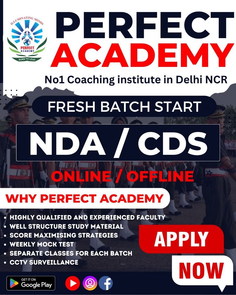 Dreaming of serving the nation as a proud Defence Officer? Join Perfect Academy, the leading NDA Coaching in Ghaziabad, where success meets dedication. With expert faculty, personalized guidance, and result-driven strategies, we help aspirants unlock their full potential. Our interactive sessions, regular mock tests, and disciplined environment prepare students not just for the exam—but for the challenges of life at NDA. Step into a world of excellence, confidence, and commitment with Perfect Academy—your trusted path to a shining career in the Indian Armed Forces.