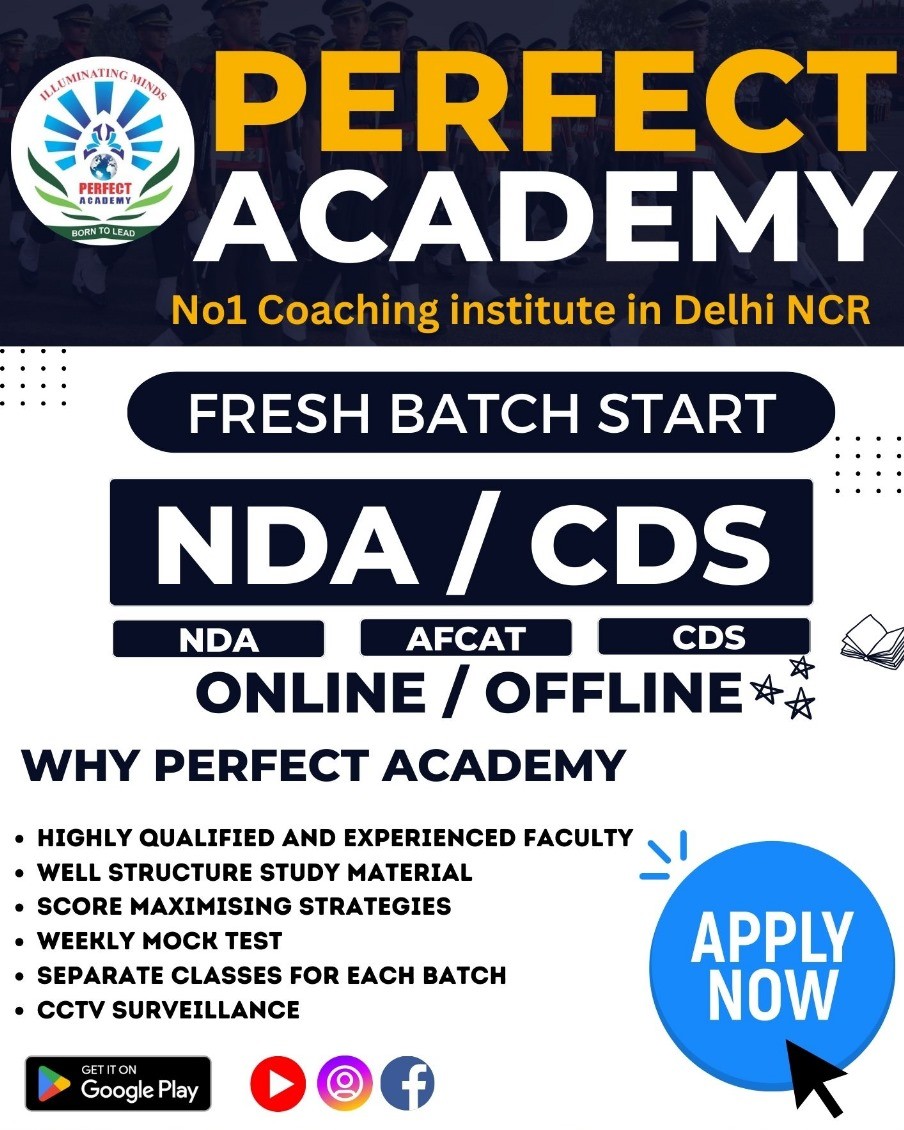 Looking for the best guidance to crack the National Defence Academy exam? Perfect Academy in Ghaziabad stands out as a trusted name for NDA coaching. The academy is dedicated to building strong fundamentals through expert teaching, strategic preparation, and regular performance analysis. With small batch sizes, students receive individual attention, helping them improve faster and stay focused on their goals. From written exam preparation to SSB interview training, Perfect Academy provides complete support under one roof. Join Perfect Academy and take a confident step towards a proud career in the defence forces.